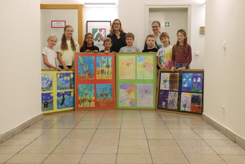 Kurz vor Beginn der Sommerferien sorgten acht Grundschulkinder der St.-Georg-Schule Hiddingsel für einen besonderen Farbtupfer im Schulamt für den Kreis Coesfeld. Gemeinsam mit ihrer Schulleiterin Petra Giebelhausen überreichten sie am Dienstagmorgen vier kunstvoll gestaltete Bilderrahmen an die Mitarbeitenden des Amtes.